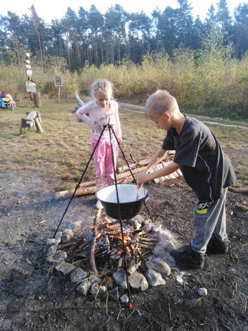 Hledali jsme mimo jiné i vhodný krmelec, kam děti vysypaly donesené kaštany posbírané v minulých dnech na vycházkách u řeky. Krásné prostředí a připravené ohniště nám posloužilo nejen k opékání buřtů a po absolvování Hopíkovy stezky lesem jsme zde také uvařili v kotlíku gulášovou polévku, což se ukázalo největším hitem výletu. Všichni chtěli krájet cibuli, brambory, míchat v kotlíku, prostě se zúčastnit a přispět. Někdo se věnoval hrám, ke kterým vybízely atrakce v místě. Jídlo z kotlíku a ešusů