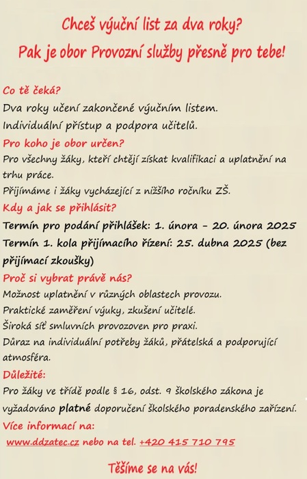 Kritéria pro přijímací řízení pro šk. rok 2025/26 - učební obor Provozní služby denní forma naleznete zde: kritéria Provozní služby denní